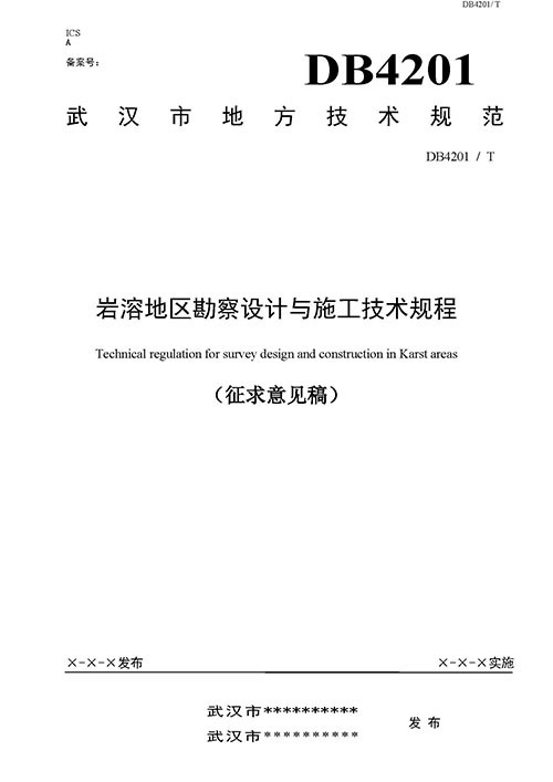 根據(jù)《市質監(jiān)局關于下達2018年度武漢市地方標準制修訂項目計劃的通知綜合管理類(第二批)》(武質技監(jiān)標[2018]5號)的要求,由武漢市勘察設計有限公司聯(lián)合相關單位共同起草的武漢市地方標準《巖溶區(qū)勘察設計與施工技術規(guī)程》(附件1)已完成征求意見稿。按照有關規(guī)定,現(xiàn)征求貴單位意見。請將意見填入對應《征求意見反饋表》(附件2)并加蓋單位公章后,紙質版(或掃描件)于2019年07月20日前反饋給武漢市勘察設計有限公司,逾期不復函,視為無意見。