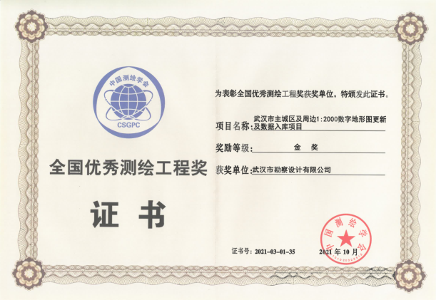 “武漢市主城區(qū)及周邊1:2000數(shù)字地形圖更新及數(shù)據(jù)入庫項目”榮獲2021年中國測繪學(xué)會全國優(yōu)秀測繪工程獎金獎