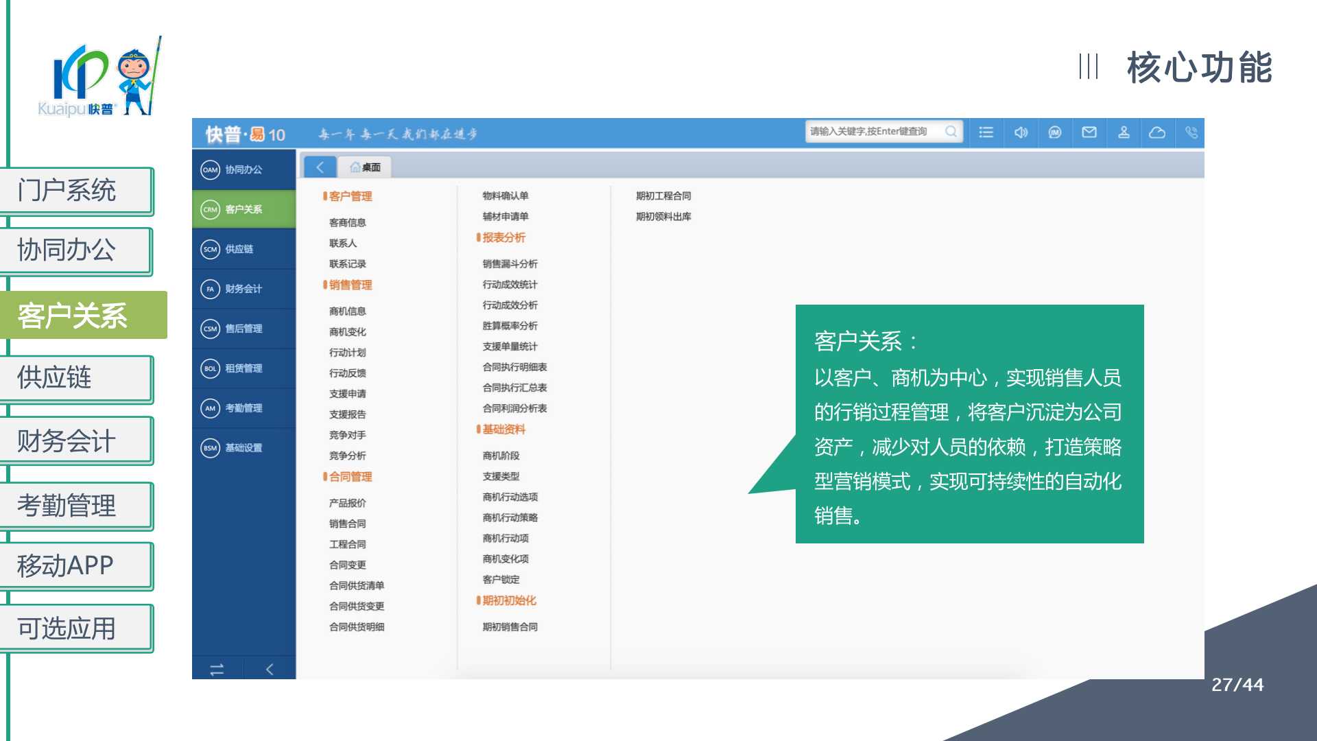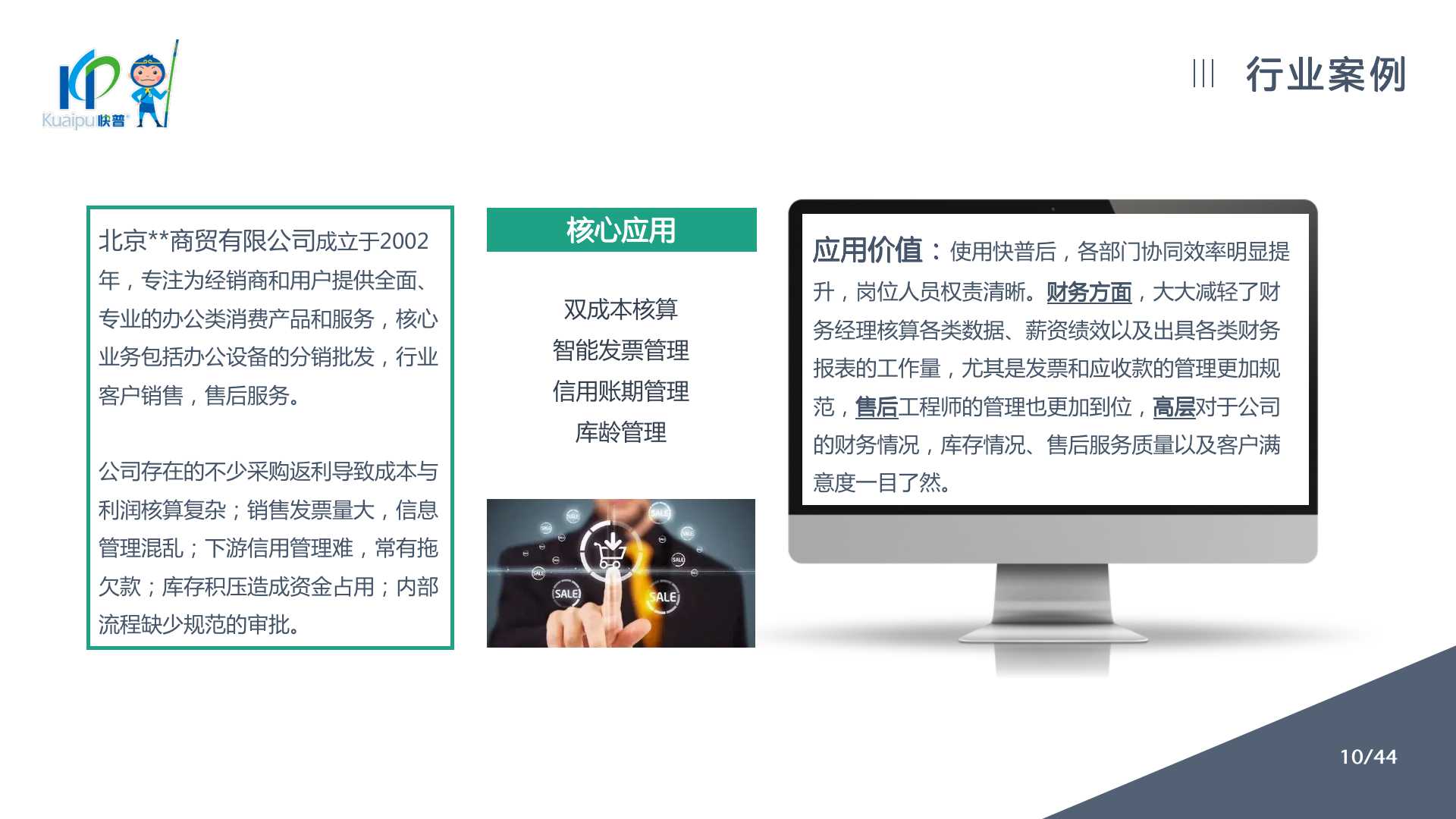 快普易10(商貿(mào)版)提供以客戶為中心的數(shù)字化管理解決方案,涵蓋客戶、銷售、庫存、資金、財務等業(yè)財一體化管理,全面優(yōu)化流程、提高企業(yè)效率,讓每一筆生意明明白白!