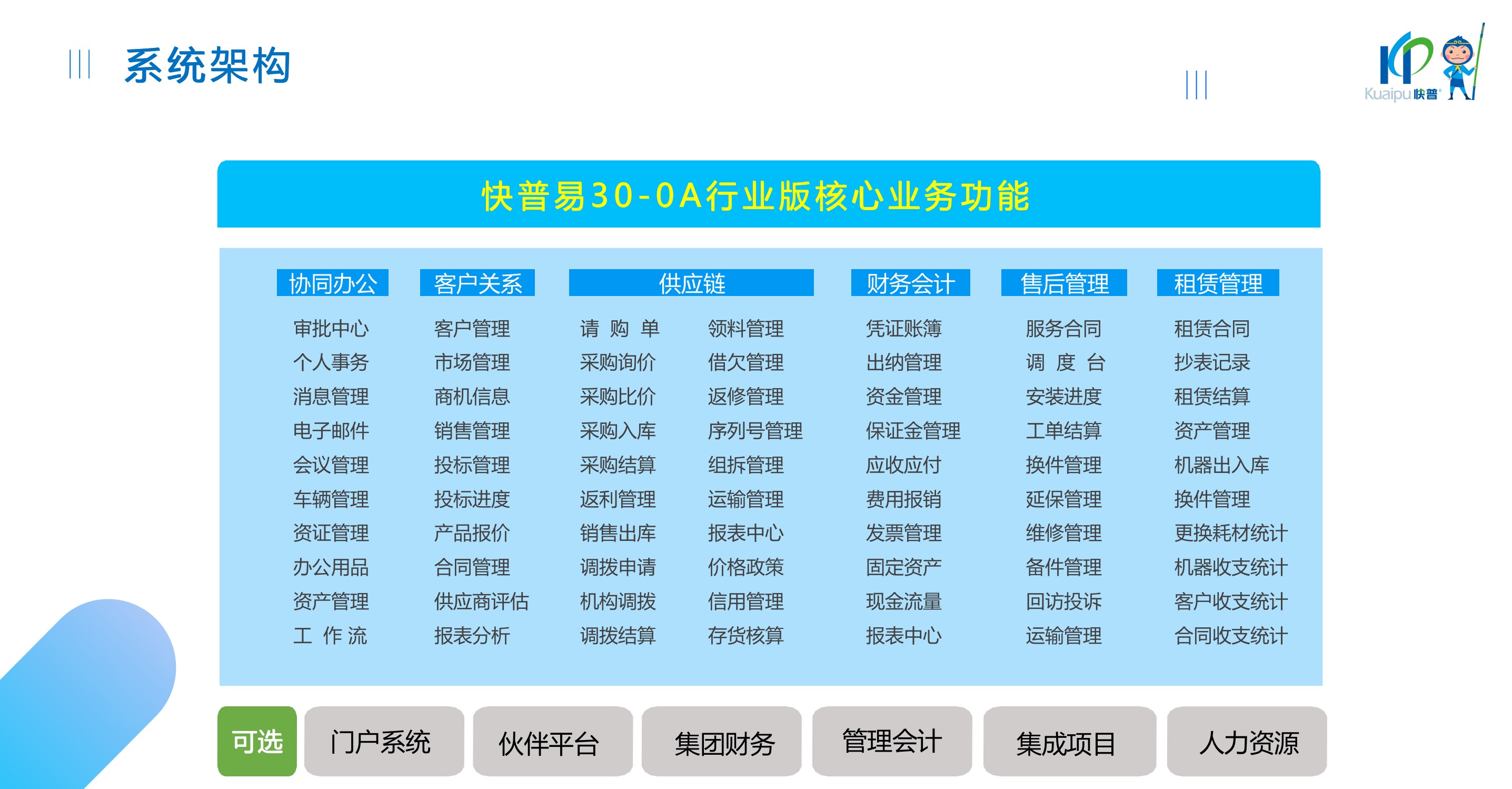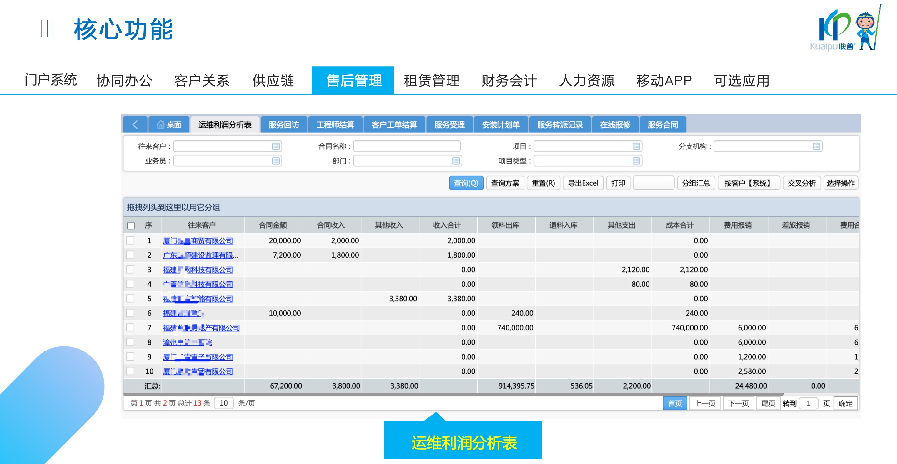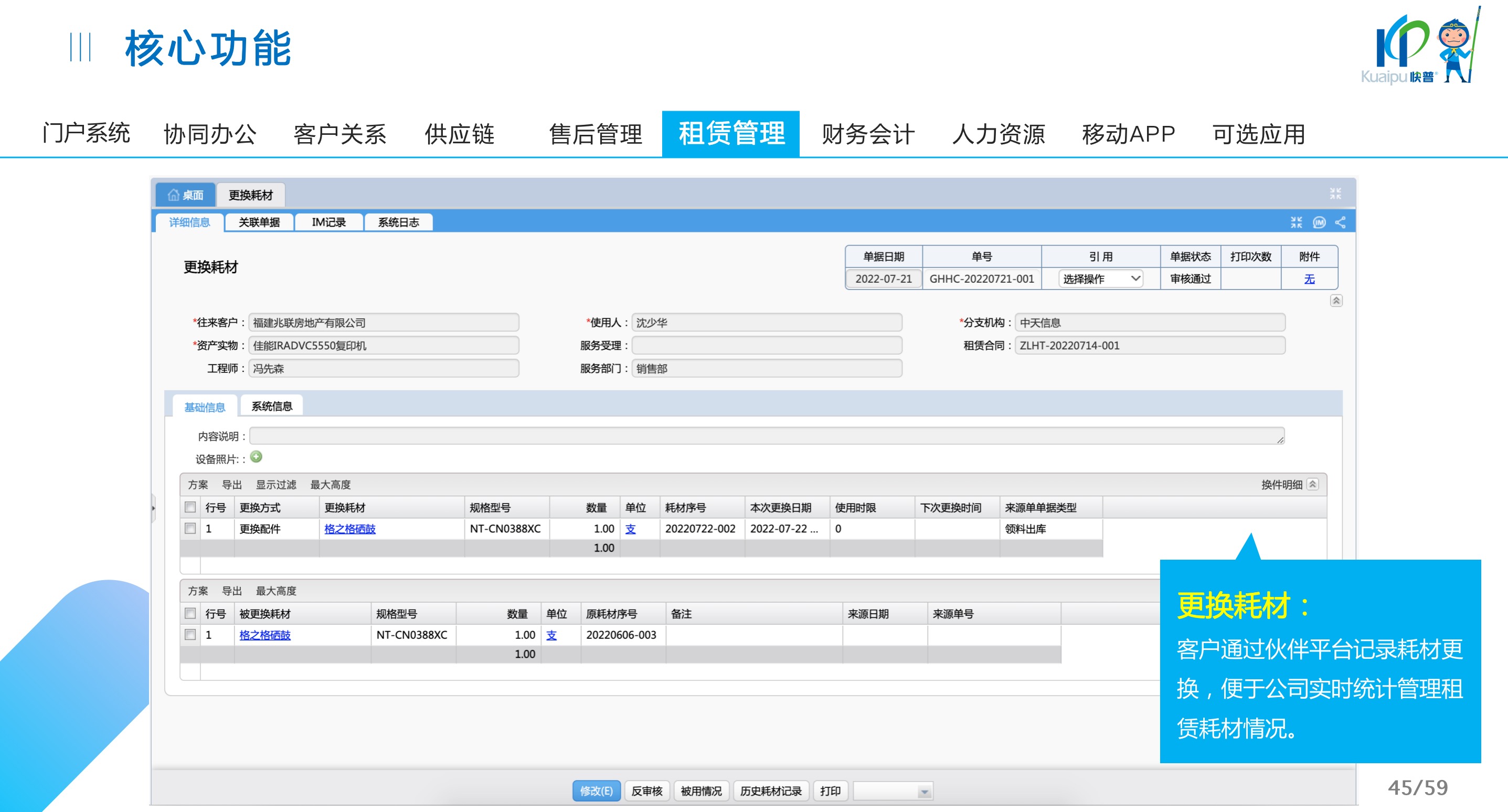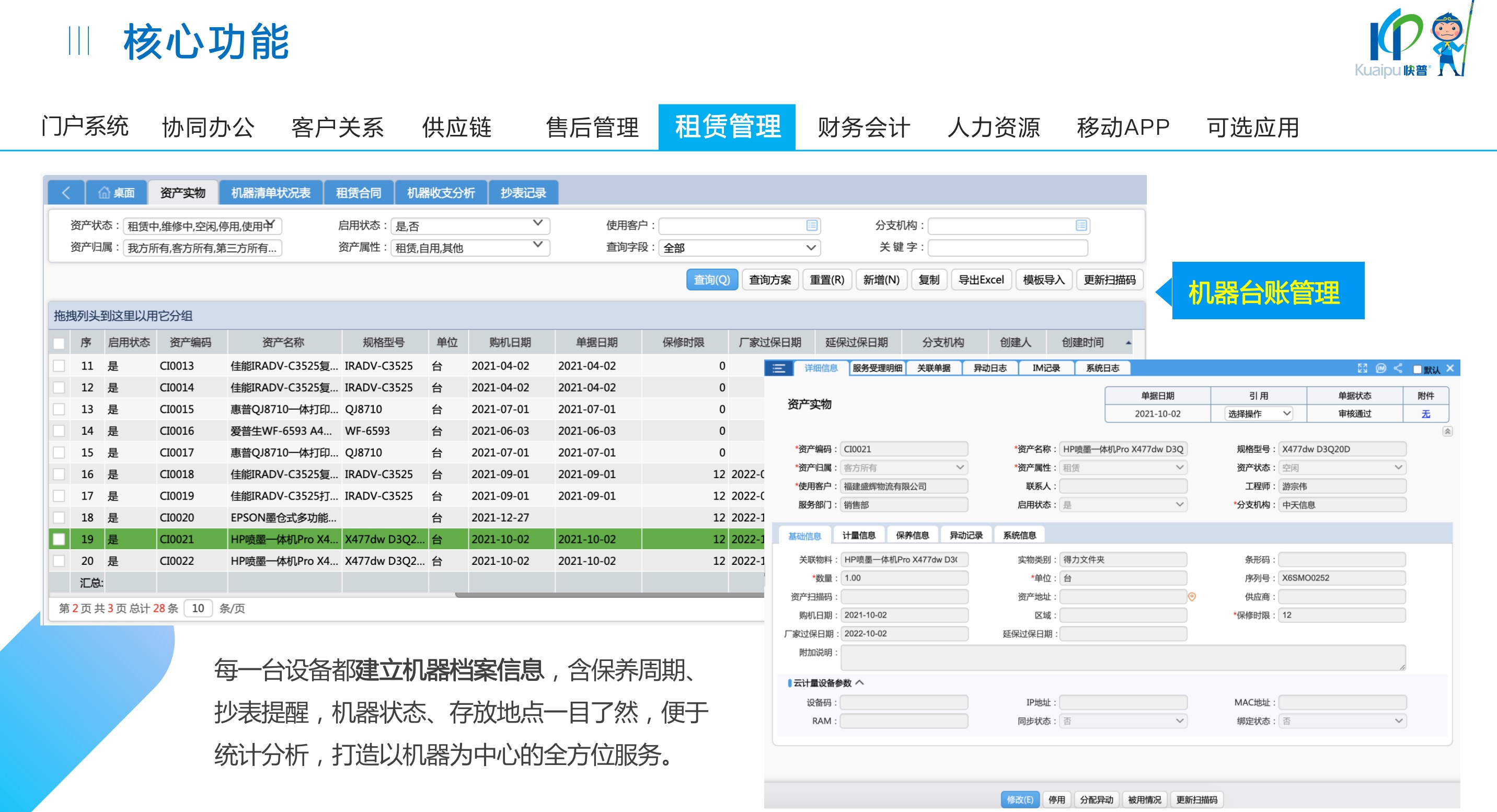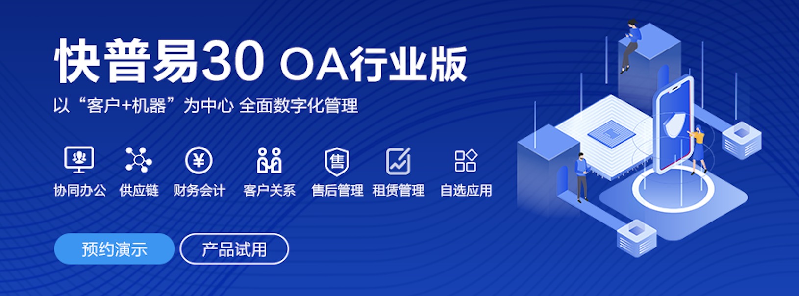 快普易30基于快普近20年在全國(guó)上萬(wàn)家OA企業(yè)的實(shí)施與服務(wù)經(jīng)驗(yàn),融合了行業(yè)成功的管理智慧,以“客戶+機(jī)器”為中心提供數(shù)字化轉(zhuǎn)型解決方案,全面解決銷售、服務(wù)、租賃等多種業(yè)務(wù)模式的管理需求,以及企業(yè)經(jīng)營(yíng)核算分析。