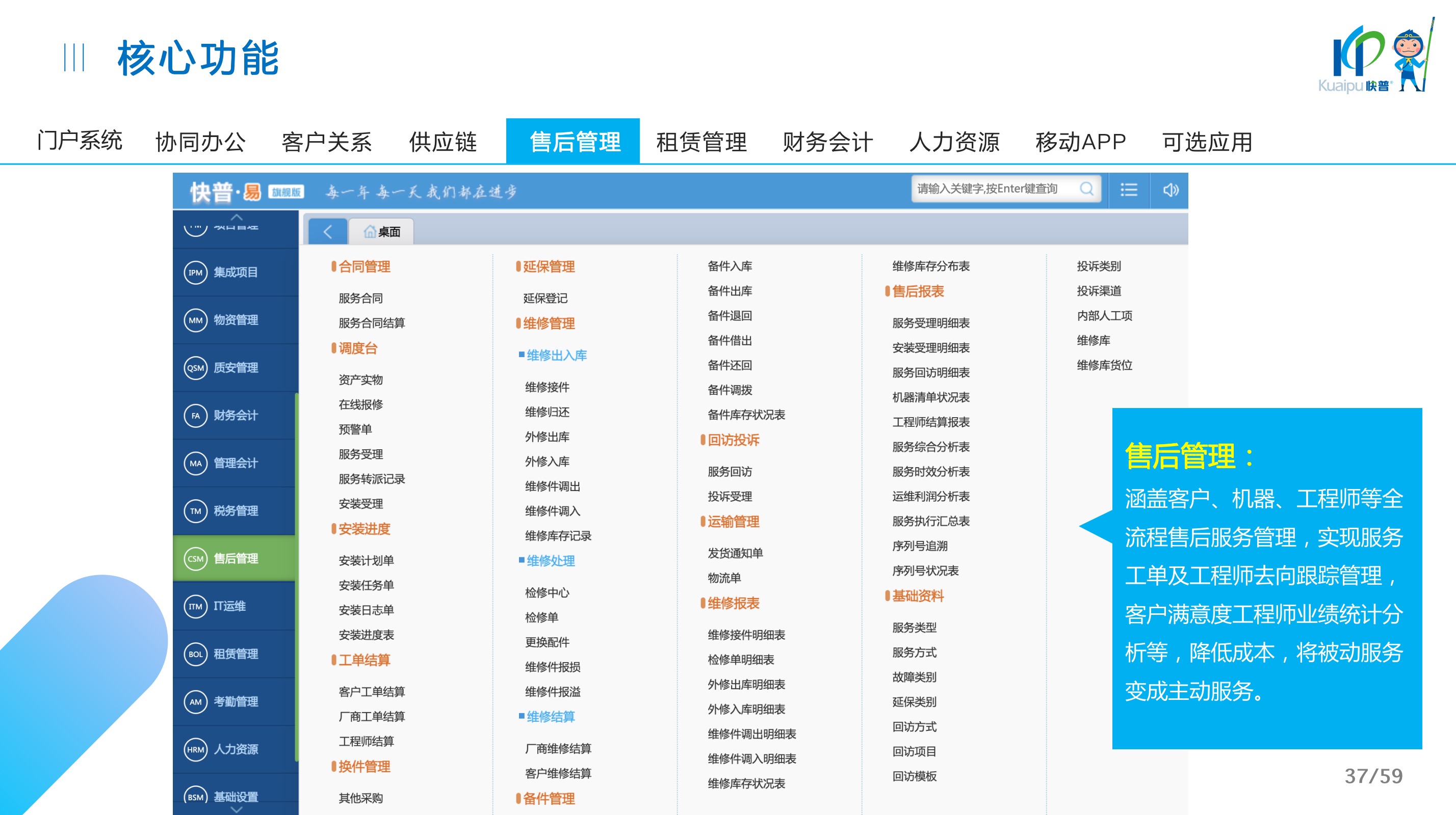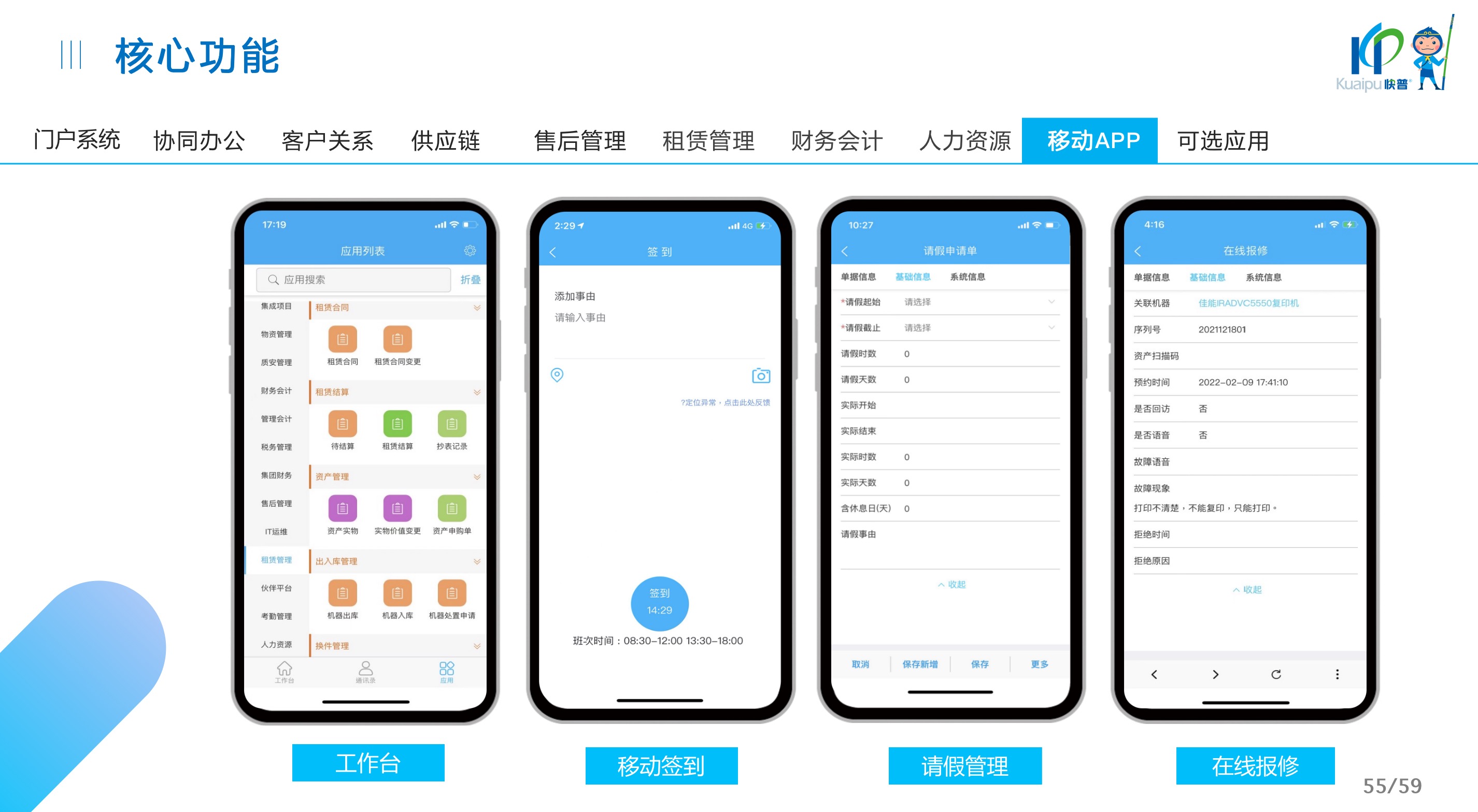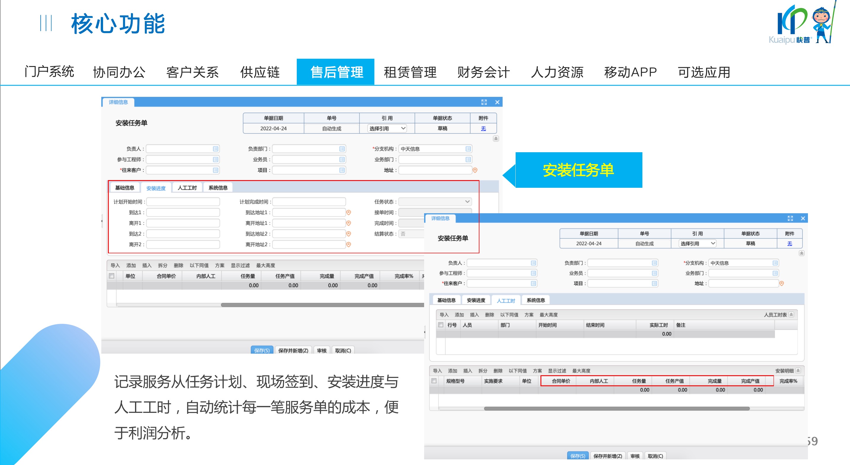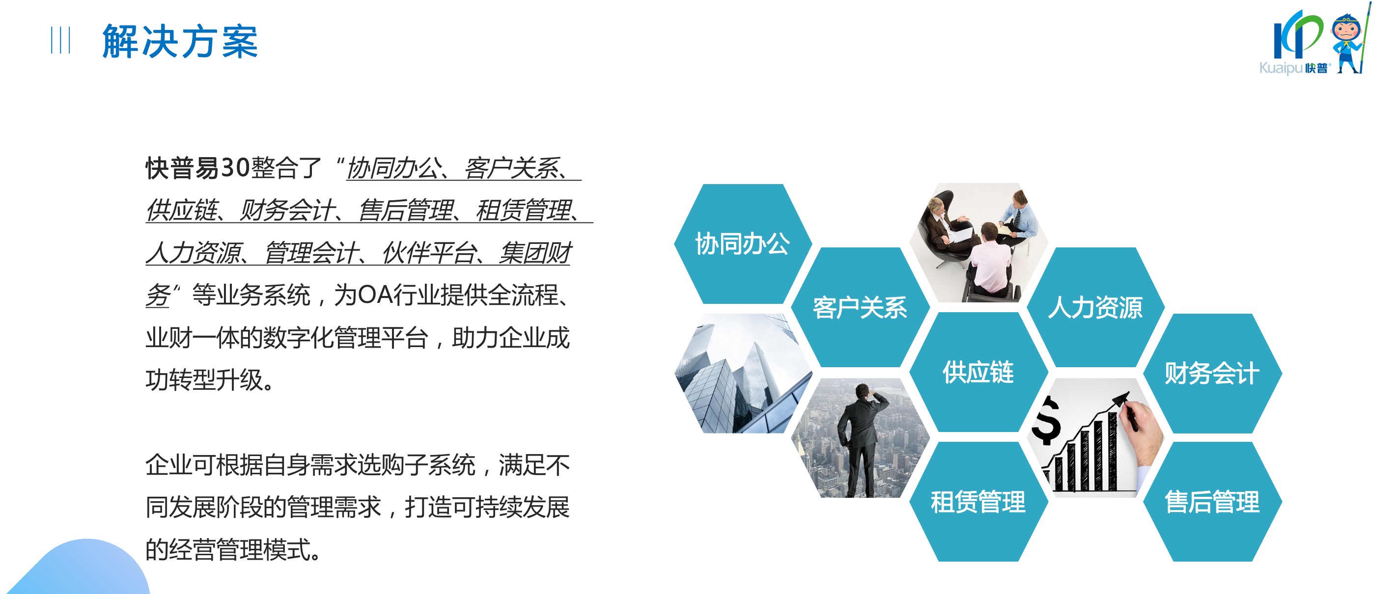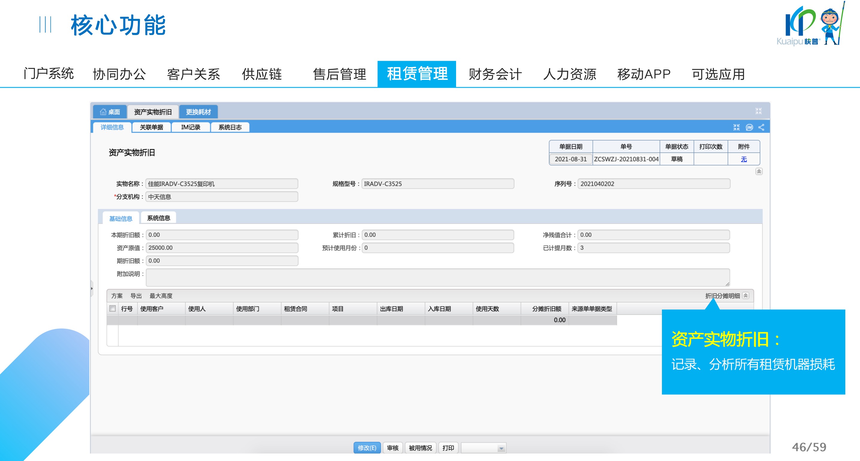 快普易30基于快普近20年在全國(guó)上萬(wàn)家OA企業(yè)的實(shí)施與服務(wù)經(jīng)驗(yàn),融合了行業(yè)成功的管理智慧,以“客戶+機(jī)器”為中心提供數(shù)字化轉(zhuǎn)型解決方案,全面解決銷售、服務(wù)、租賃等多種業(yè)務(wù)模式的管理需求,以及企業(yè)經(jīng)營(yíng)核算分析。