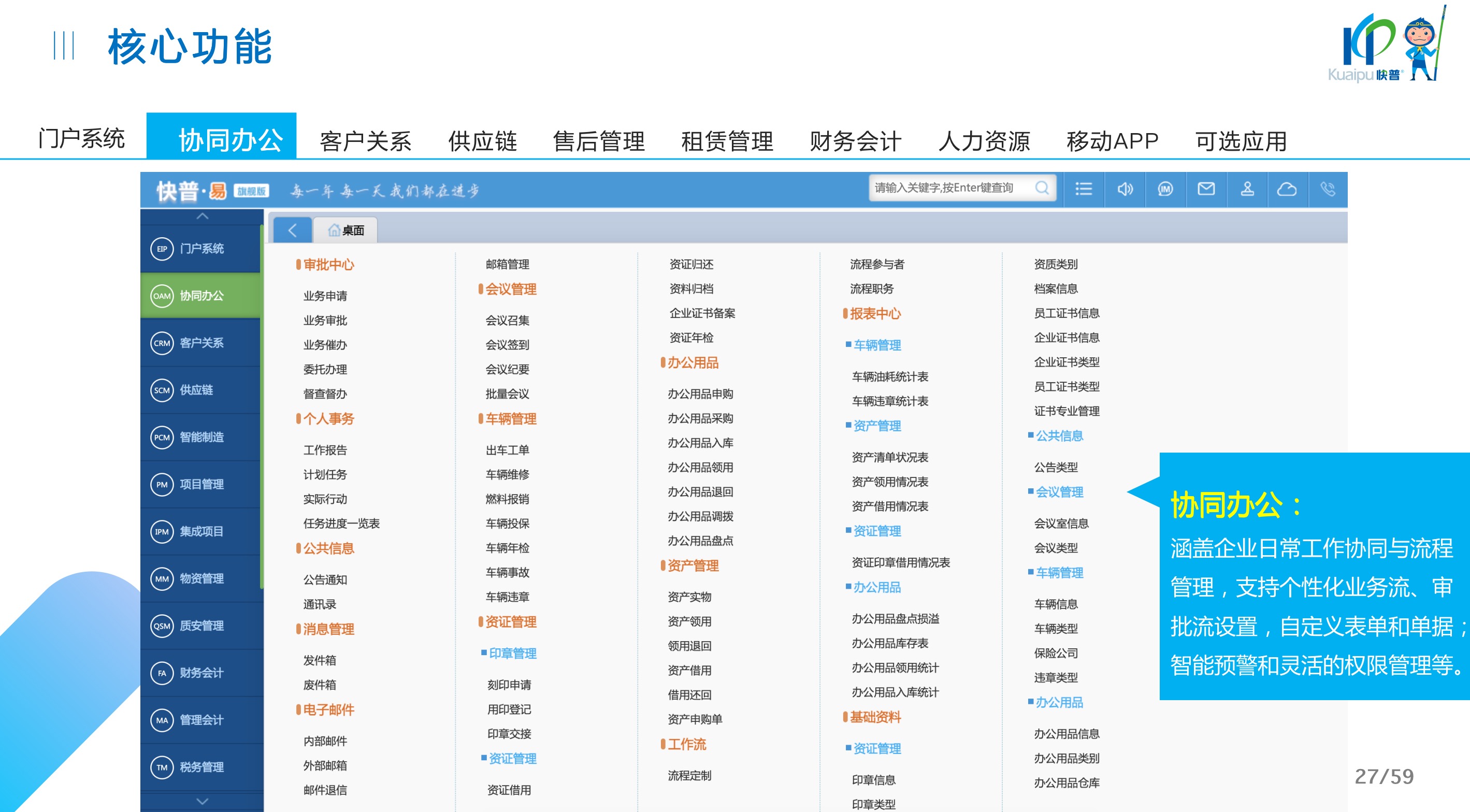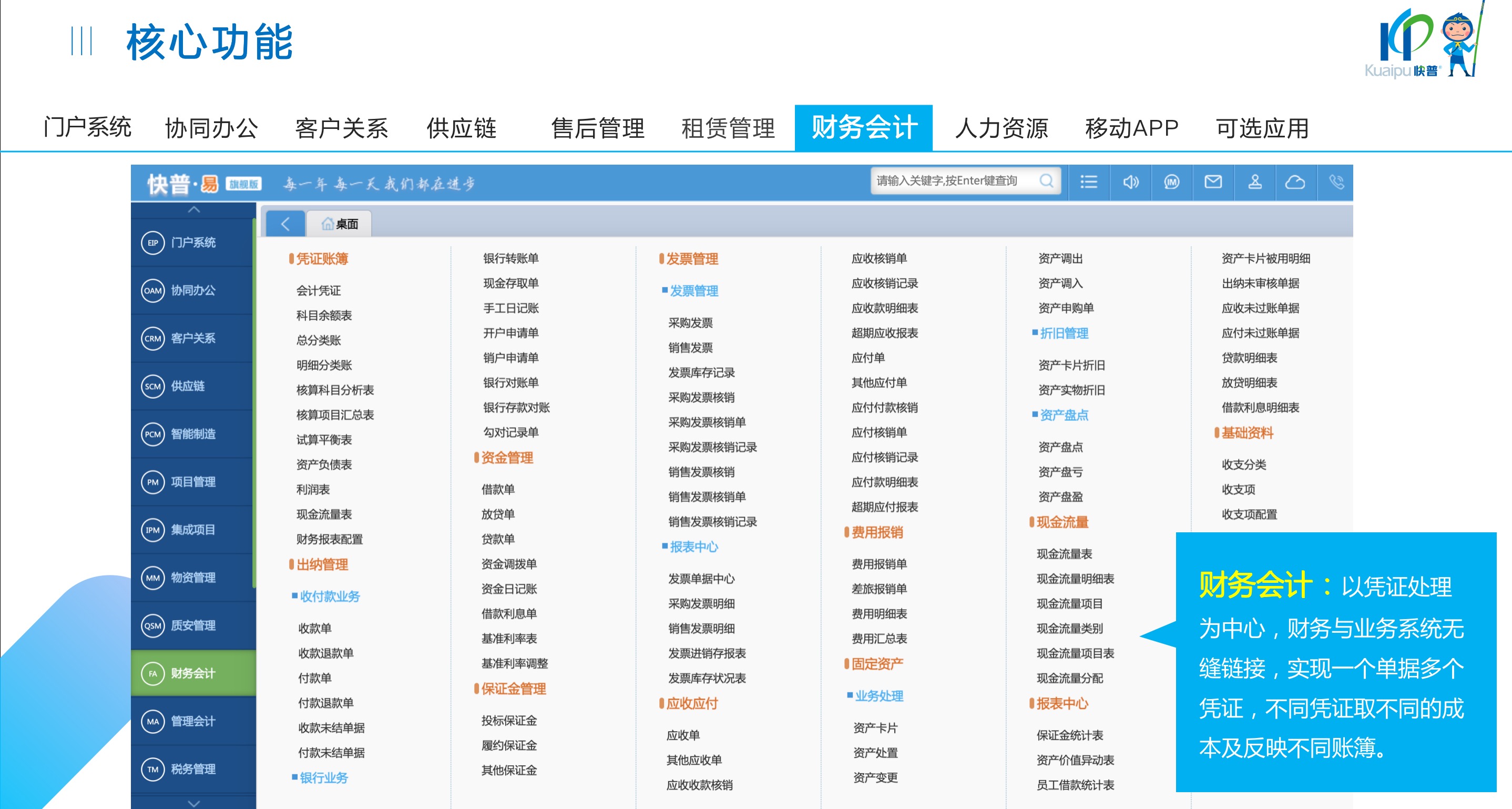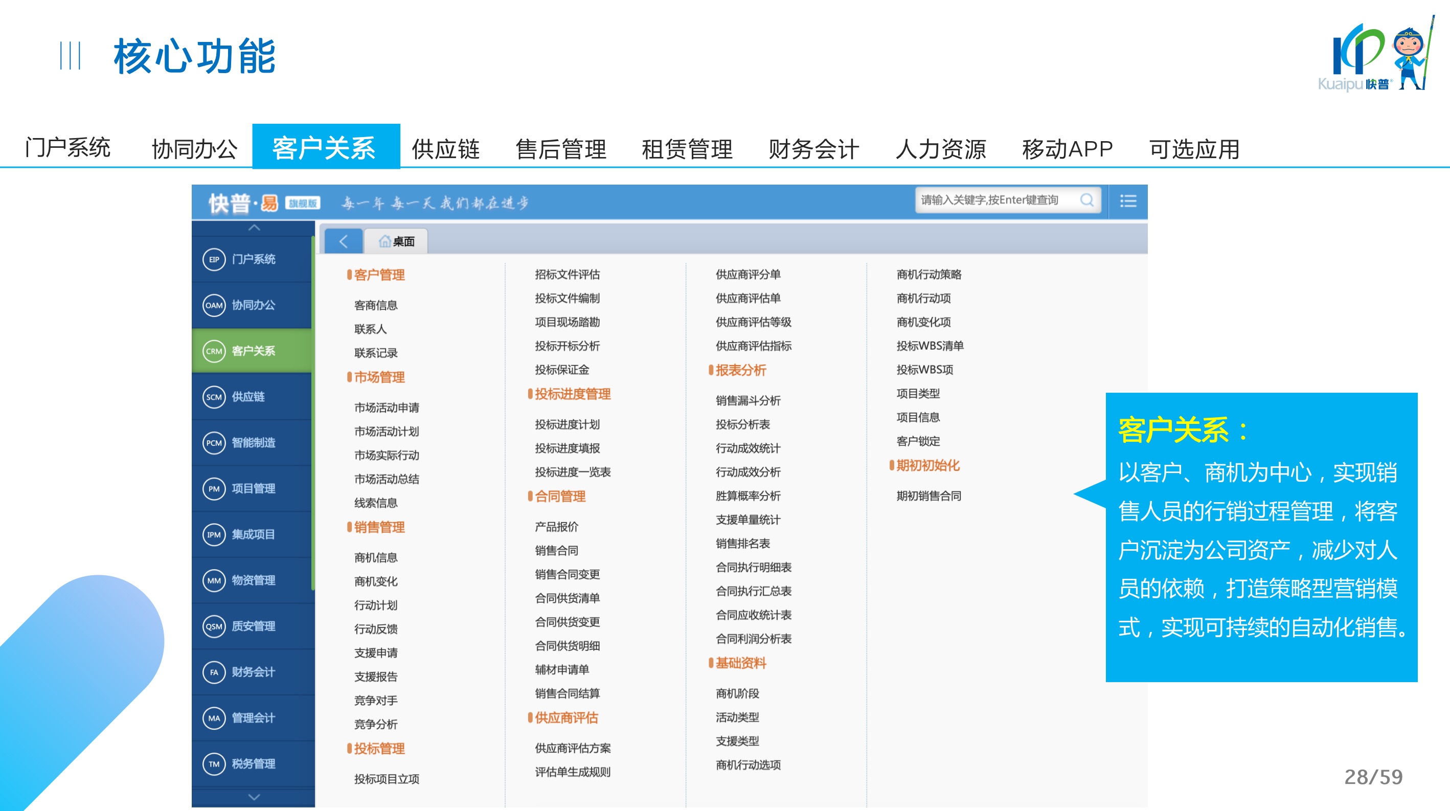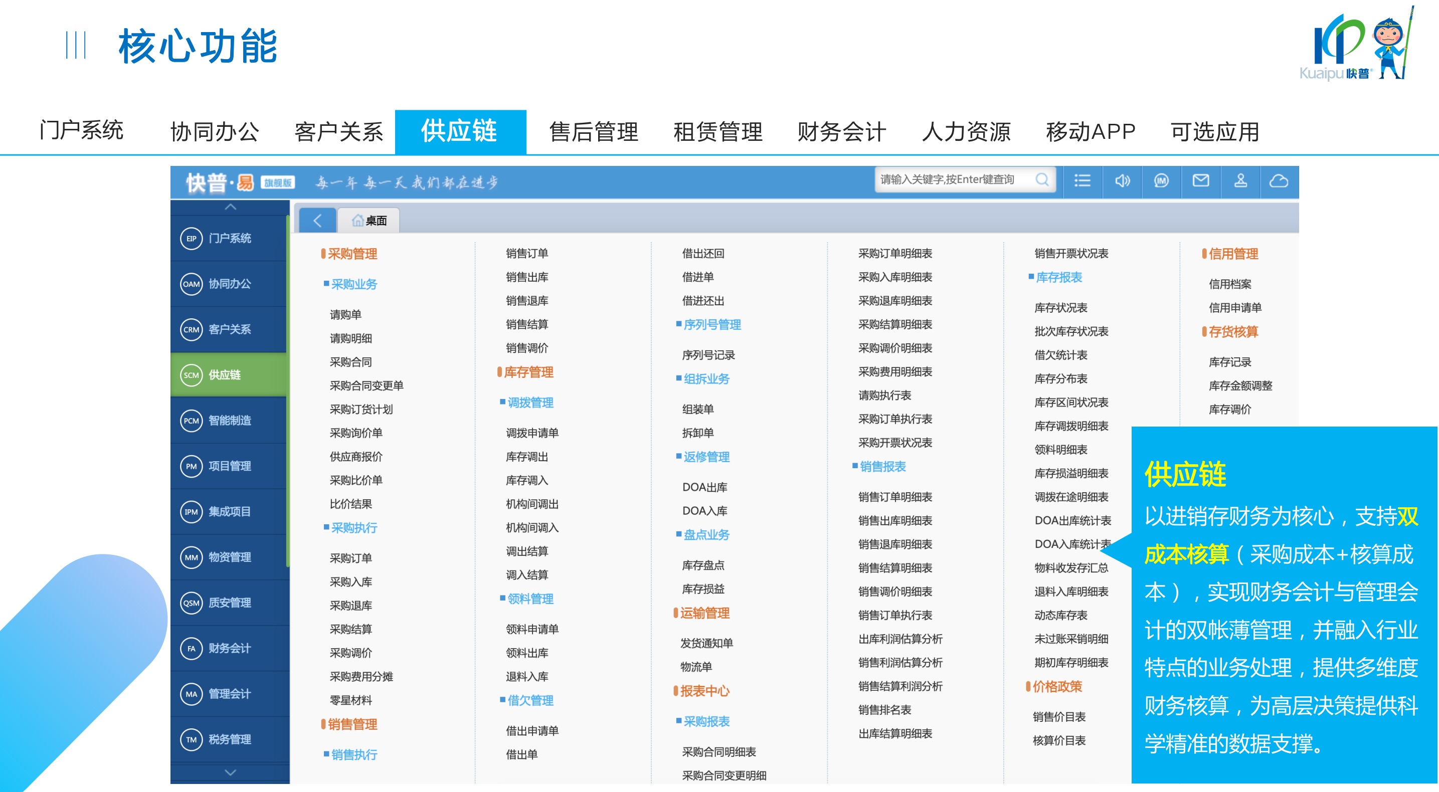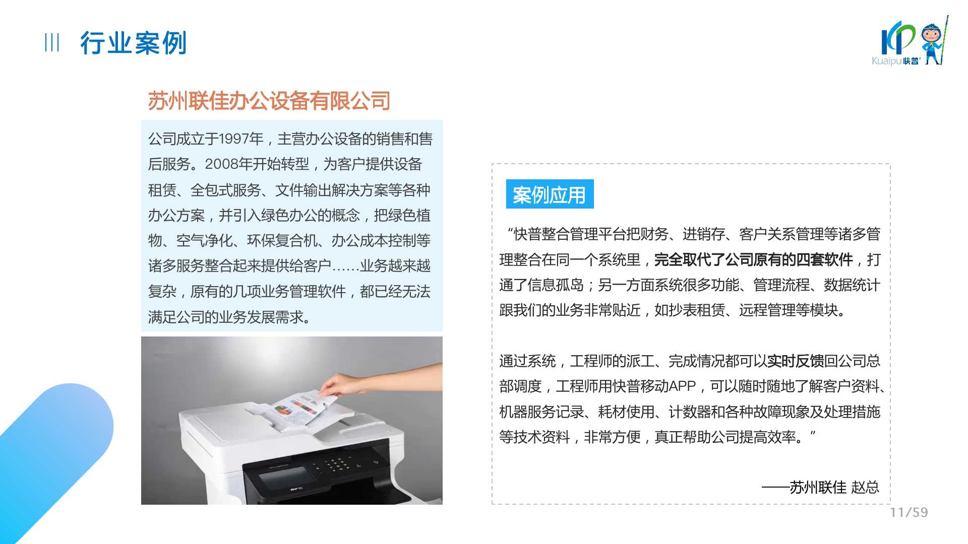 快普易30基于快普近20年在全國(guó)上萬(wàn)家OA企業(yè)的實(shí)施與服務(wù)經(jīng)驗(yàn),融合了行業(yè)成功的管理智慧,以“客戶+機(jī)器”為中心提供數(shù)字化轉(zhuǎn)型解決方案,全面解決銷售、服務(wù)、租賃等多種業(yè)務(wù)模式的管理需求,以及企業(yè)經(jīng)營(yíng)核算分析。