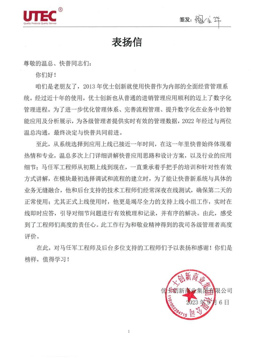 【簡(jiǎn)訊】老客戶優(yōu)士創(chuàng)新商業(yè)集團(tuán)有限公司(以下簡(jiǎn)稱“優(yōu)士創(chuàng)新”)向我司發(fā)來(lái)感謝信,對(duì)快普的平臺(tái)、產(chǎn)品和團(tuán)隊(duì)服務(wù)給予了高度肯定,并特別對(duì)實(shí)施工程師馬任軍的專業(yè)、敬業(yè)及高度責(zé)心提出了表?yè)P(yáng)和贊賞。