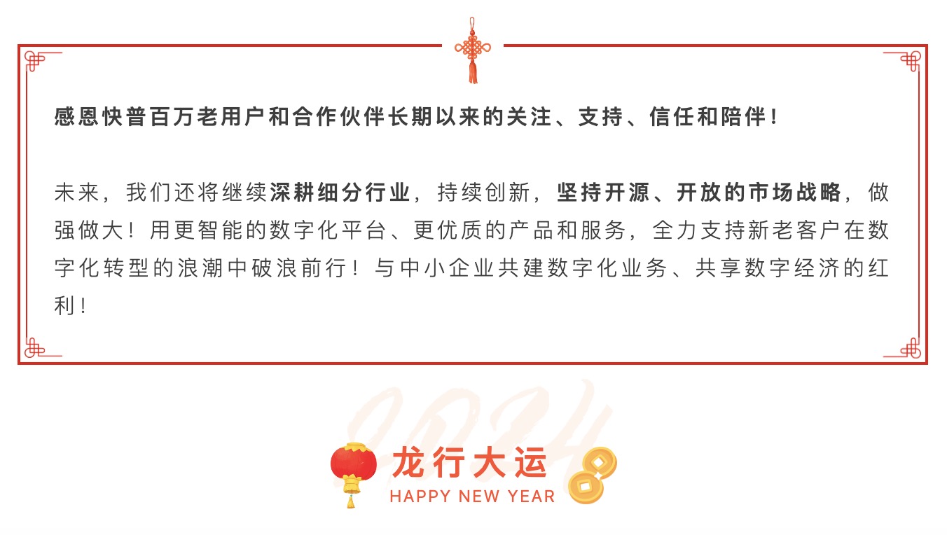 2023年是快普銳意改革、開拓進(jìn)取的一年。面對機(jī)遇和挑戰(zhàn),我們苦練內(nèi)功,加大研發(fā)投入,積極擁抱市場,通過新一代“易”系列產(chǎn)品,幫助大量企業(yè)成功實(shí)現(xiàn)數(shù)字化的轉(zhuǎn)型升級,賦能企業(yè)邁向高質(zhì)量發(fā)展!同時,快普也實(shí)現(xiàn)了自身的逆勢增長,多項(xiàng)科技創(chuàng)新成果獲得了政府的嘉獎與社會各界的好評!2024年,我們不忘初心,堅(jiān)守“數(shù)字化平臺服務(wù)商”的使命,1月份再創(chuàng)多項(xiàng)佳績!