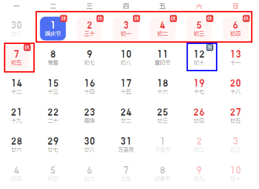 “藍色框”為補班時間、“紅色框”為放假時間: