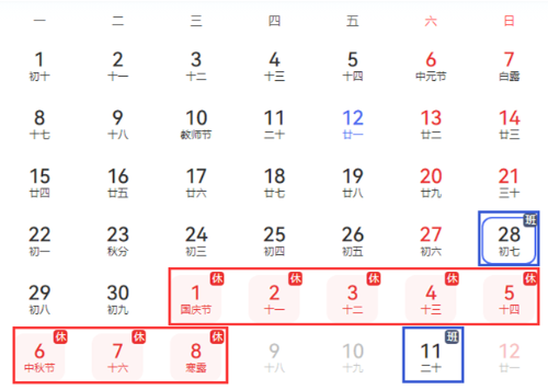 放假調(diào)休安排如圖所示: “藍色框”為補班時間、“紅色框”為放假時間